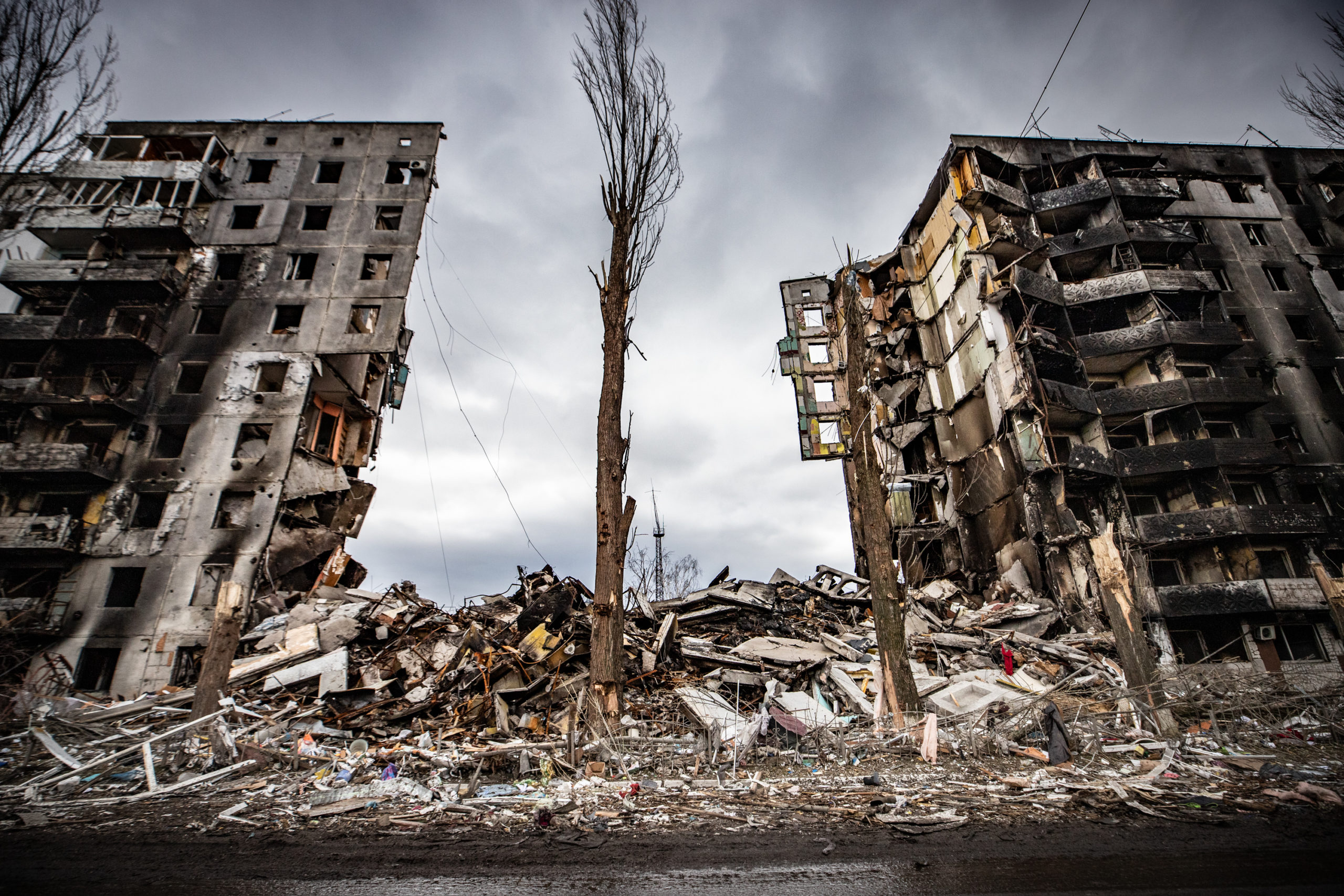 The 8 May speech given by Ukraine’s president Zelensky is a good illustration of Ukraine’s official aesthetics of the ongoing war in relation to the WWII. In this carefully directed video he stands in front of a destroyed residential building in the town of Borodianka, Kyiv region. It was one of the first to be occupied by the Russian army in an attempt of a pincer movement towards Kyiv and remained under occupation for over a month. Most of the buildings have been destroyed in artillery and aerial strikes; although over 80% of the town’s 13,000 inhabitants managed to escape, several hundred civilians are considered dead. Previously Zelensky had said that the scale of destruction in this town was even worse than in the infamous Bucha, and in this video he calls the blackened rubble ‘a witness’ that has become ‘numb’. This year’s presidential address is accompanied by the endless photographic imagery of destruction and stresses the emptiness of ideological commitments: ‘Can the golden words become worthless?’.