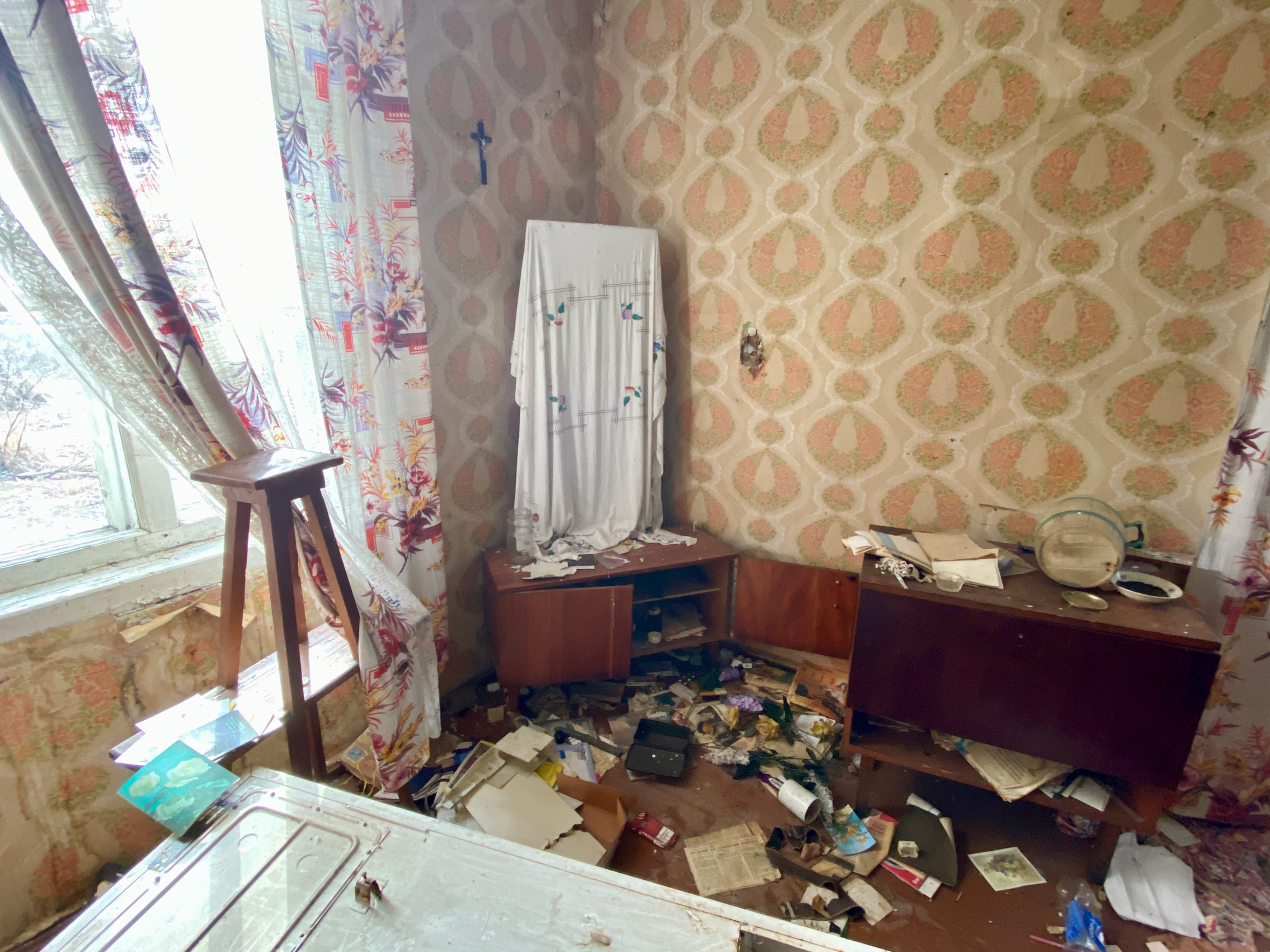 I had shot some scenes before the course because at some points during fieldwork I felt like capturing things on film. I got particularly lucky with regard to access to the abandoned house featured in the film because I had made contact with the man who was buying up abandoned railway barracks in my field site in auctions held by the State Real Estate Agency (who had taken these buildings over from the Latvian Railway). He had bought the building that contained 4 separate apartments, but he hadn’t cleared those apartments yet as he had done with other buildings. He allowed me to enter the apartments (the doors were swinging in the wind), look around, and film. The apartment featured in the film had been abandoned after the death of the last resident – a woman by the name of Rozālija. Judging by the fact that the mirror in the bedroom was covered, Rozālija died in the apartment. Covering a mirror after a person dies in the house is a traditional practice in the area. According to one of the folk explanations given locally, the soul wishes to linger by looking at itself in the mirror, therefore the mirror has to be covered. Rozālija’s things were still in the apartment – a karakul coat, dresses, sheets, dishes, bills, and postcards. There were also some empty bottles on the floor, suggesting that someone had either partied or stayed briefly in the apartment following her death. There were curtains on all the windows. This is quite common in abandoned houses. The windows have curtains, and the doors are sometimes locked. Departing residents seem to want to keep strangers out, even if they aren’t planning to return. The man who bought this building bought it with the remains of previous lives.