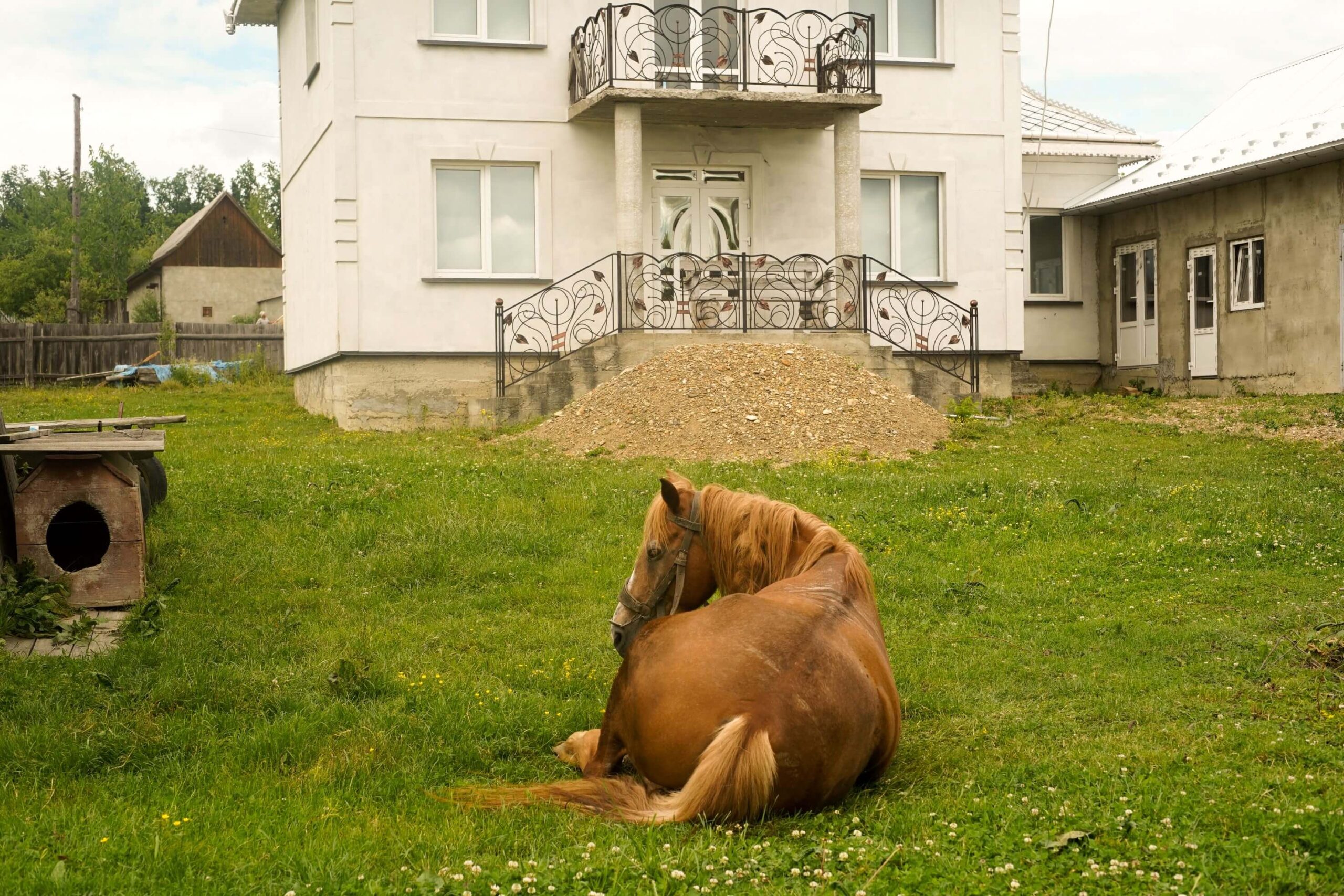 The village landscape is contradictory. Derelict kolkhoz and timber factory buildings never fail to elicit head-shaking from interlocutors over the age of 50, who lament the place’s decline. Yet in 2025, the mayor claimed ‘city’ status (misto, Ukrainian) based on 10,444 registered inhabitants, while economic vitality appears to flourish through ostentatious ‘palace halls’ – some funded by border trafficking, rumours say – and uncanny alleys of identical villas lining roadsides. Looking closer, the structures seem lifeless and many houses are still under construction.